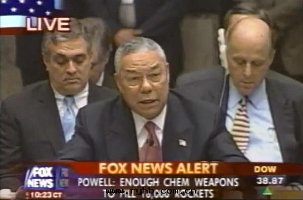 鮑威爾在(zài)聯合國(guó)聲稱伊拉克(kè)擁有(yǒu)大(dà)规模殺傷性(xìng)武器